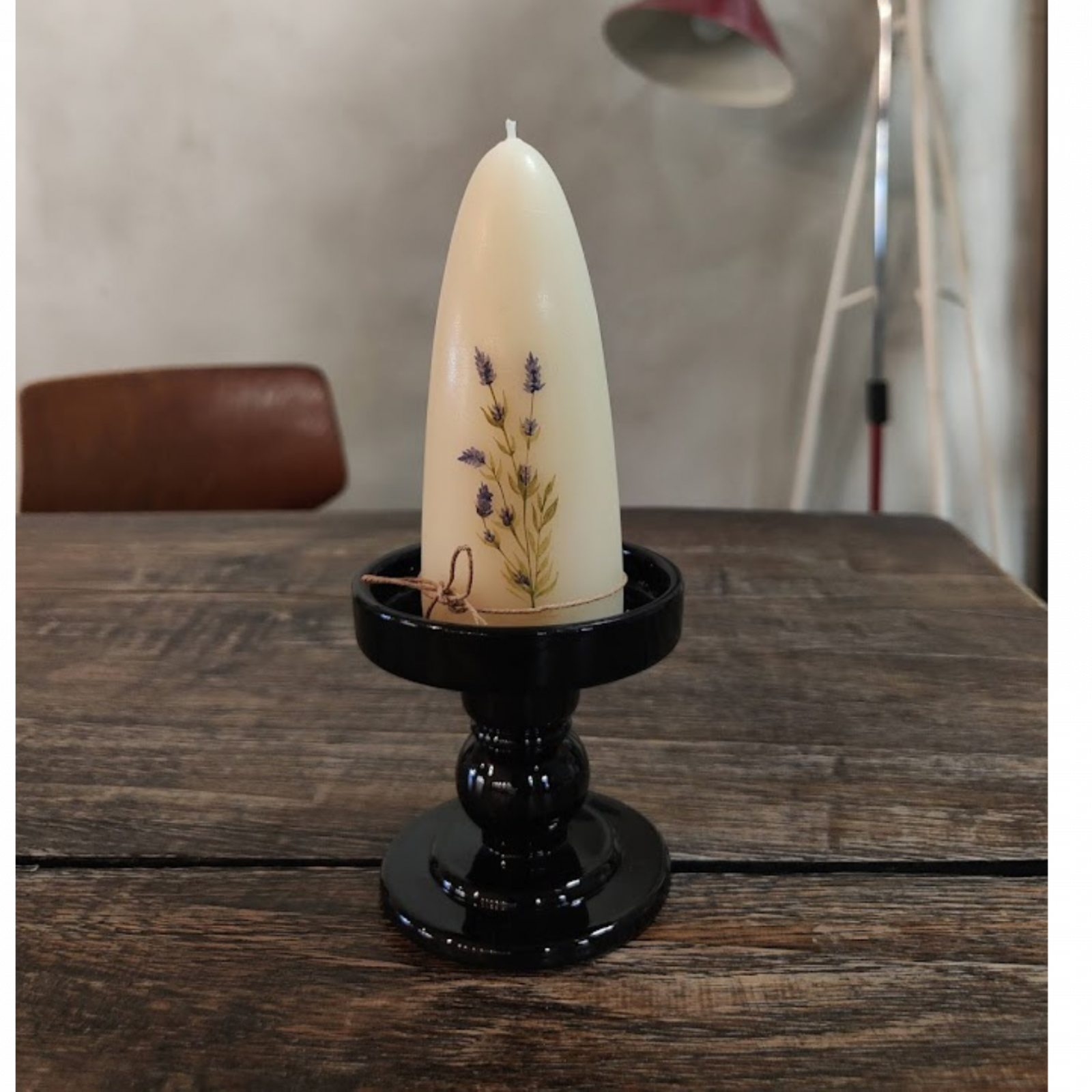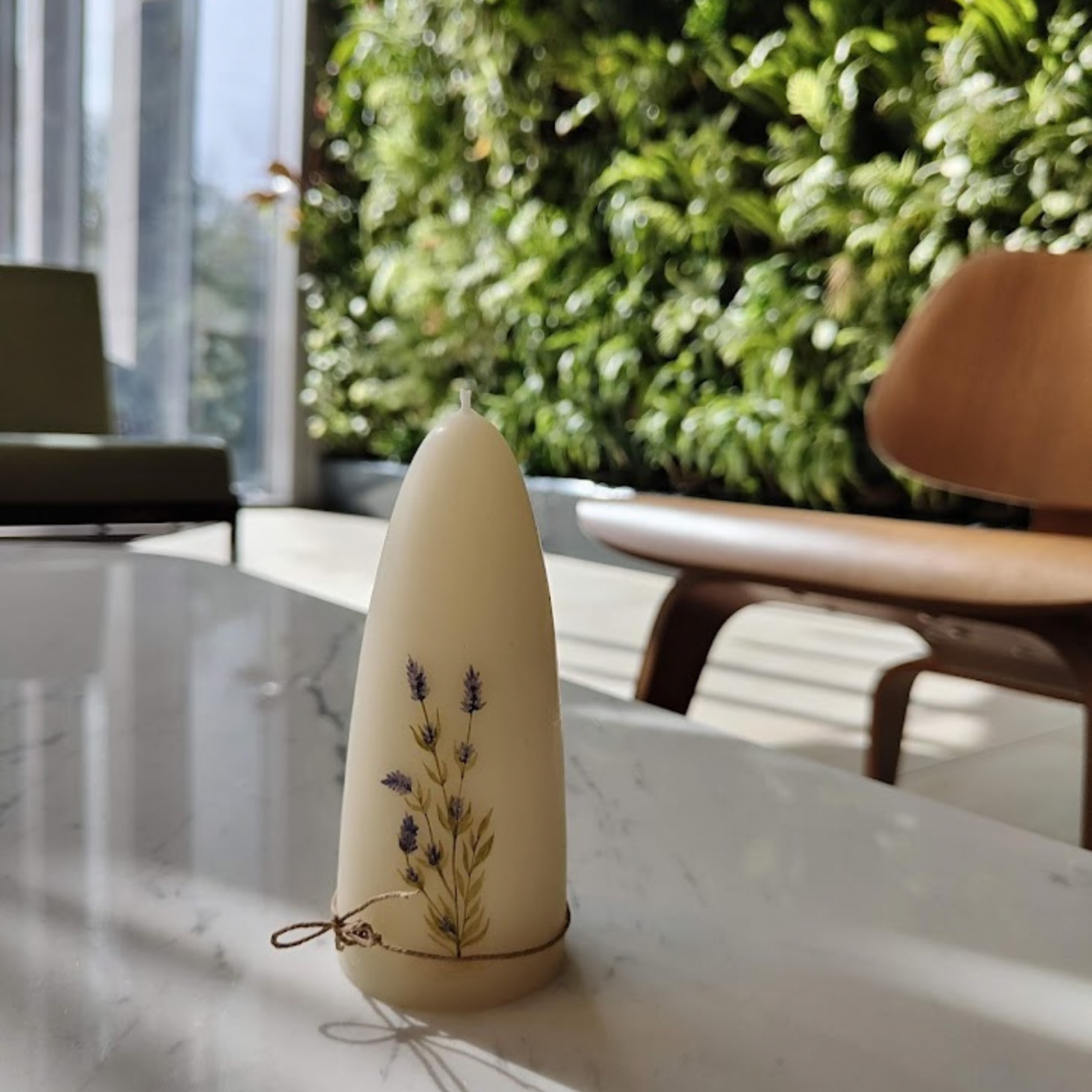 O lumânare delicată, realizată manual din ceară de albine purificată și subtil infuzată cu note citrice și florale, din uleiuri de parfum. Florile de lavandă pictate manual, cunoscute pentru proprietățile lor relaxante și calmante, ne poartă cu gândul la câmpurile de lavandă, unde aroma lor pură și reconfortantă se împletește cu aerul proaspăt al naturii. Lavanda este adesea asociată cu liniștea și echilibrul, fiind folosită de secole pentru a reduce stresul și a aduce o stare de bine. Perfectă pentru a fi oferită cadou sau pentru a înfrumuseța un colț special al casei, această lumânare simbolizează frumusețea, puritatea și serenitatea naturii.