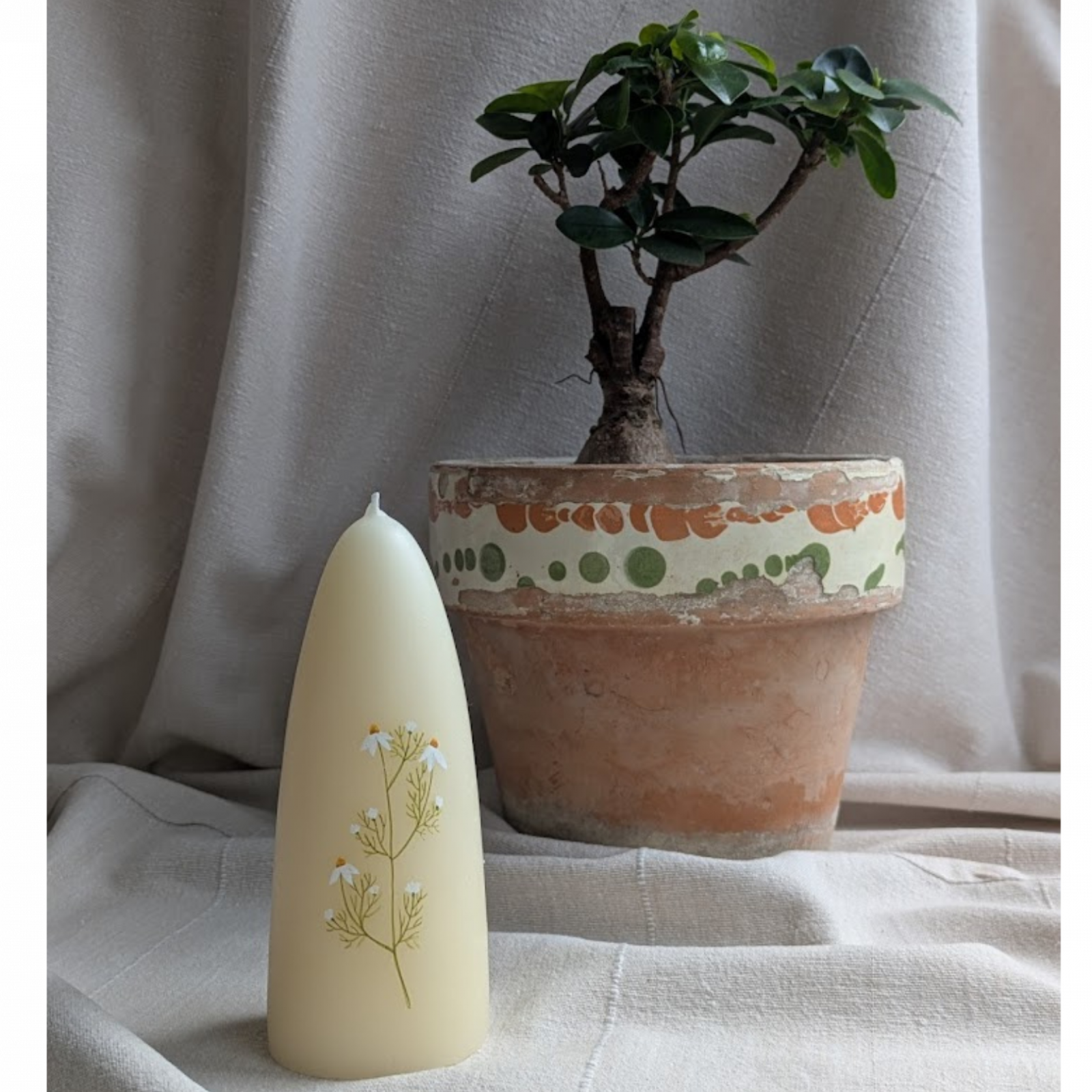 O lumânare delicată, realizată manual din ceară de albine purificată și subtil infuzată cu note citrice și florale, din uleiuri de parfum. Florile de mușețel pictate manual adaugă un farmec aparte, creând o atmosferă relaxantă și liniștitoare, ideală pentru momentele de calm. Perfectă pentru a fi oferită cadou sau pentru a înfrumuseța un colț special al casei, această lumânare este un simbol al frumuseții și purității naturii.