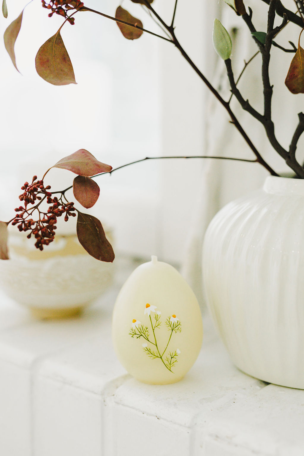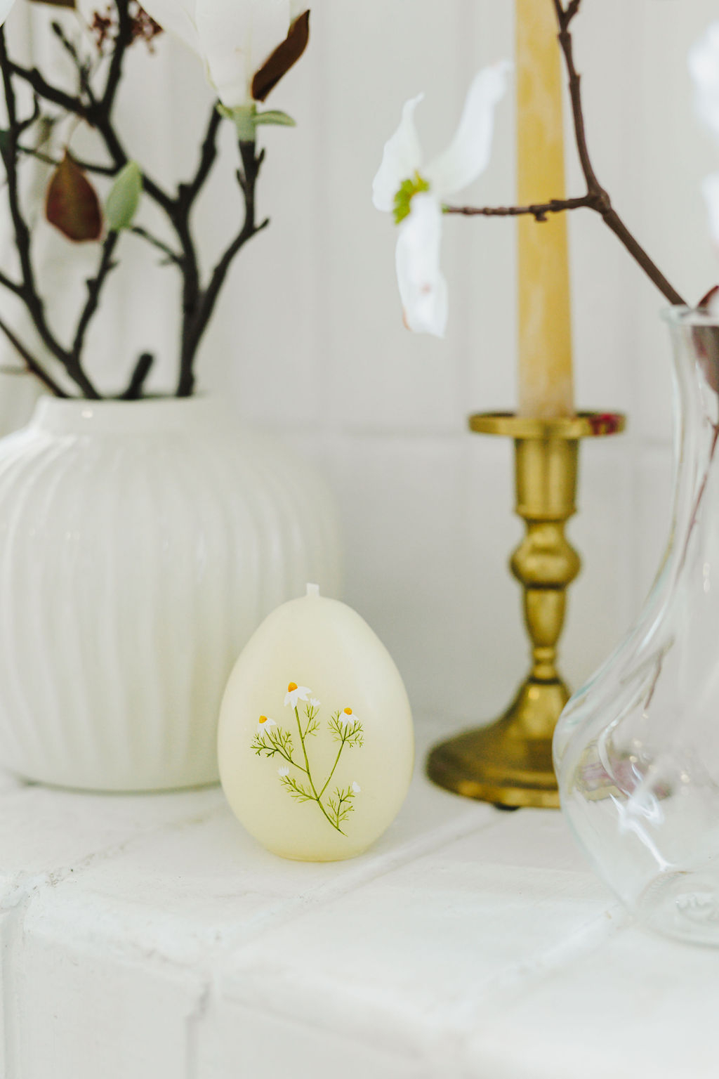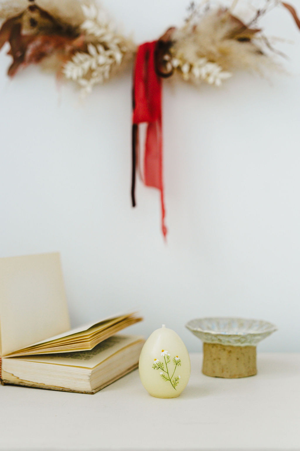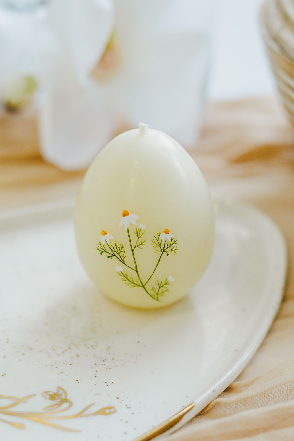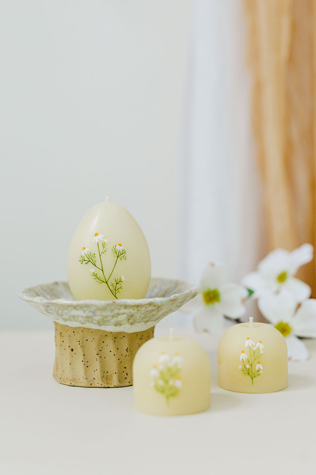 În formă de ou, această lumânare realizată manual din ceară de albine purificată și subtil infuzată cu note citrice și florale din uleiuri de parfum, evocă spiritul sărbătorilor Pascale, simbolizând renașterea și frumusețea naturii. Pictată cu flori de mușețel, crează o atmosferă relaxantă și liniștitoare, ideală pentru momentele pretrecute împreună cu familia. Perfectă pentru a înfrumuseța decorul mesei sau pentru a fi oferită cadou, această lumânare aduce un strop de puritate și armonie.