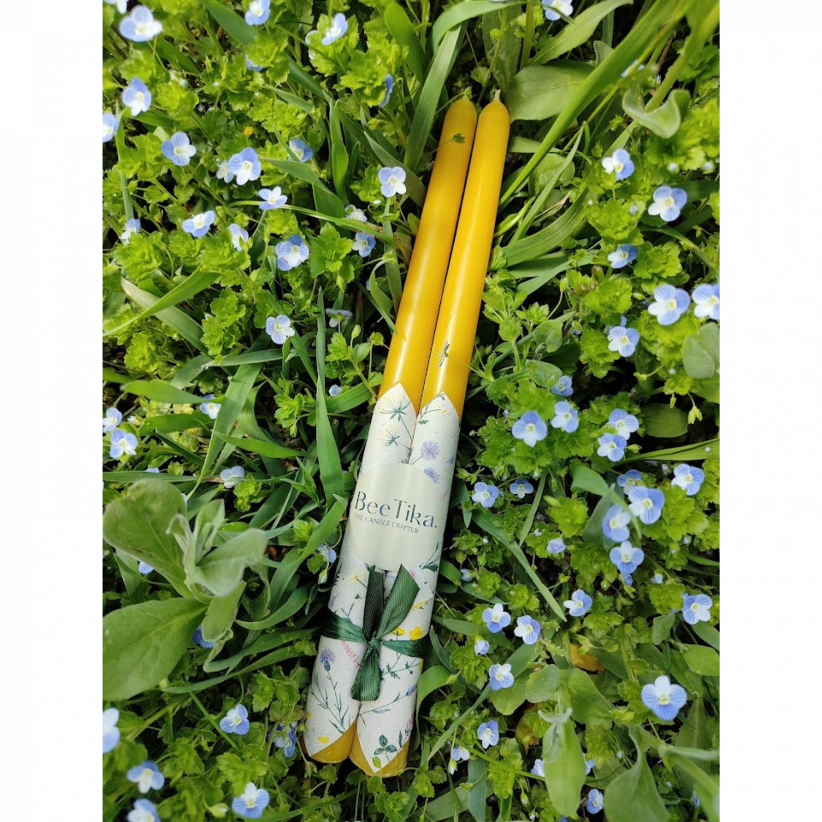 Set de două lumânări pentru sfeșnic, realizate manual din ceară de albine naturală, galbenă, așa cum ne-o oferă albinele. Cu un miros subtil de miere, aceste lumânări creează o atmosferă liniștitoare, perfectă pentru momentele în care ai nevoie de calm și relaxare.