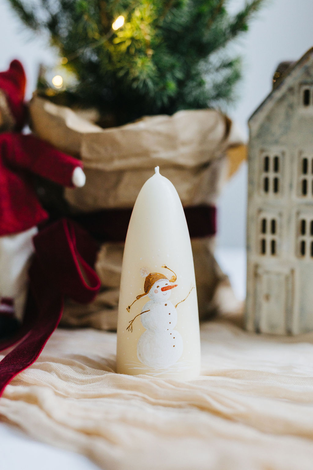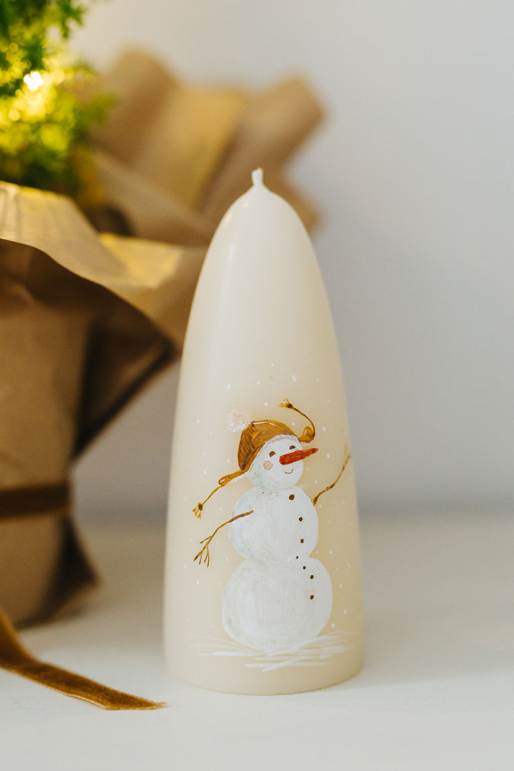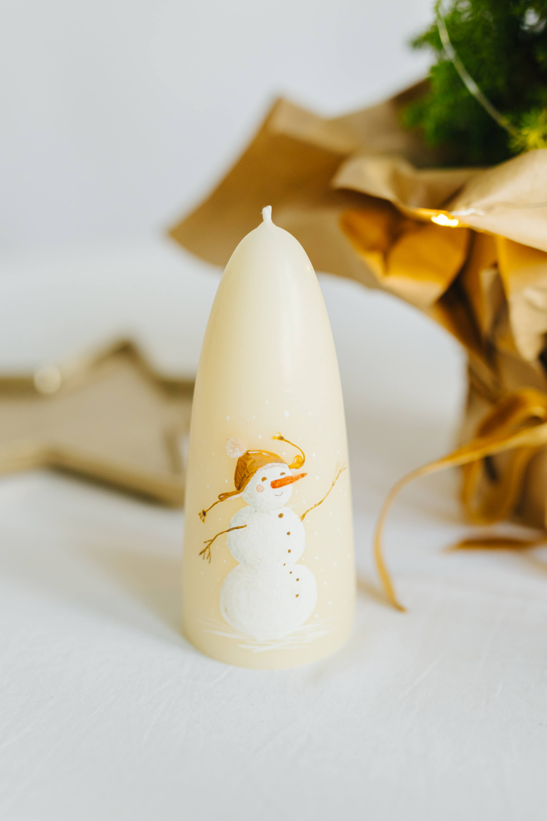 Imaginează-ți cum aprinzi o lumânare realizată manual din ceară naturală de albine, cu o lumină blândă care nu invadează spațiul, ci îl îmbracă în căldură. Pe suprafața ei, un om de zăpadă simplu și zâmbitor — ca un copil surprins în mijlocul jocului — îți amintește de bucuria autentică a iernilor de altădată. O amintire pictată cu grijă, menită să readucă în prezent magia care se ascunde în cele mai mici momente.