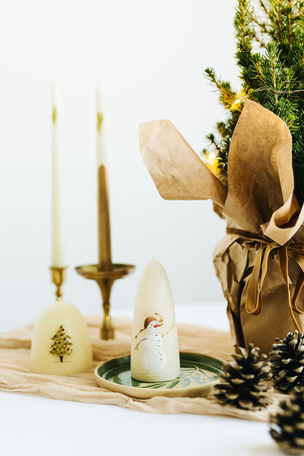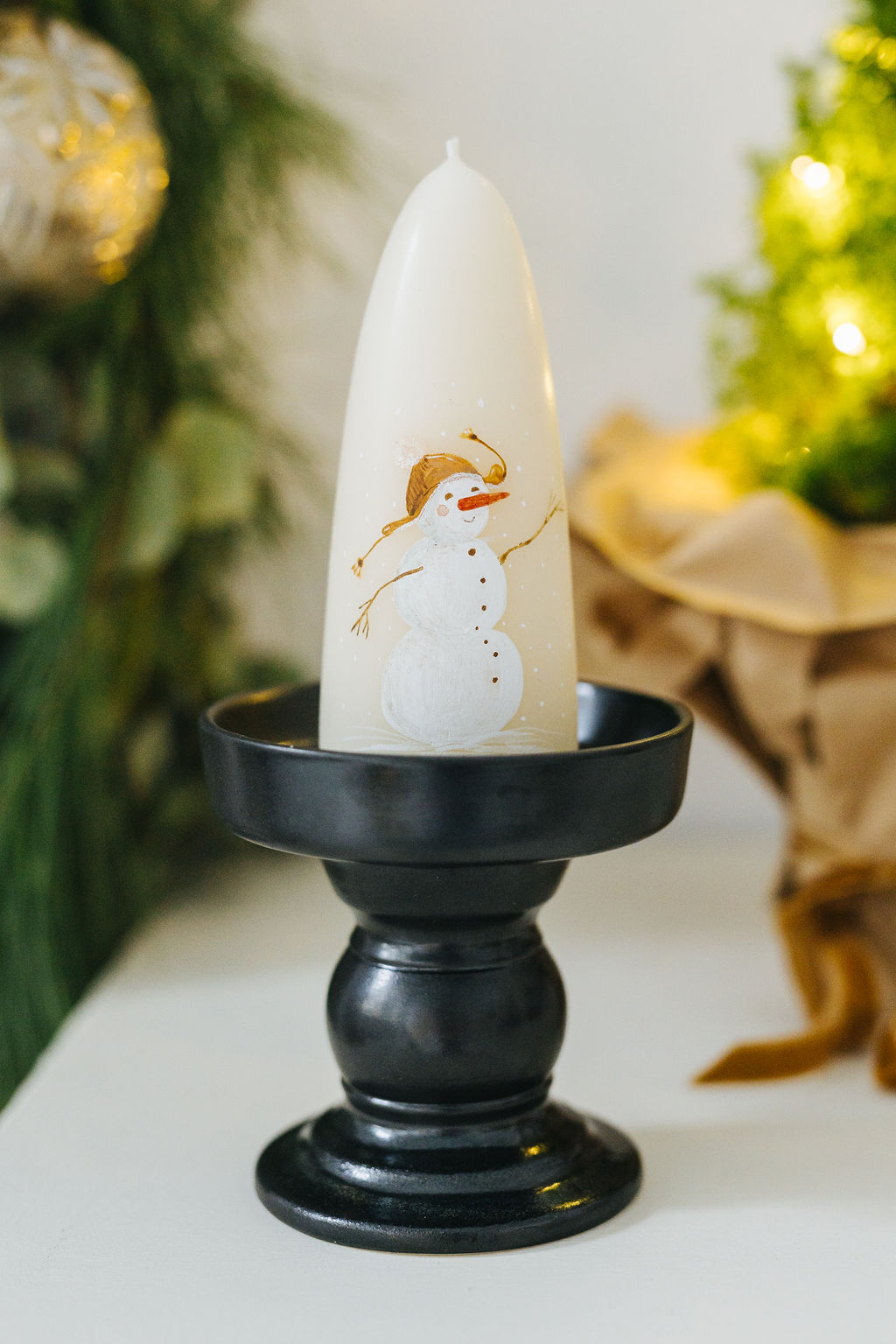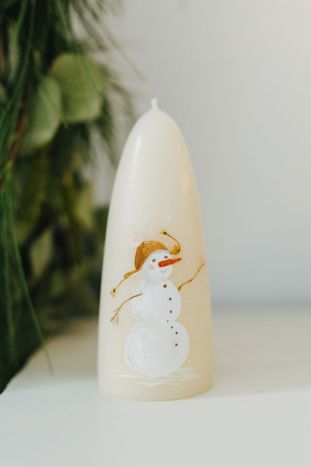 Imaginează-ți cum aprinzi o lumânare realizată manual din ceară naturală de albine, cu o lumină blândă care nu invadează spațiul, ci îl îmbracă în căldură. Pe suprafața ei, un om de zăpadă simplu și zâmbitor — ca un copil surprins în mijlocul jocului — îți amintește de bucuria autentică a iernilor de altădată. O amintire pictată cu grijă, menită să readucă în prezent magia care se ascunde în cele mai mici momente.